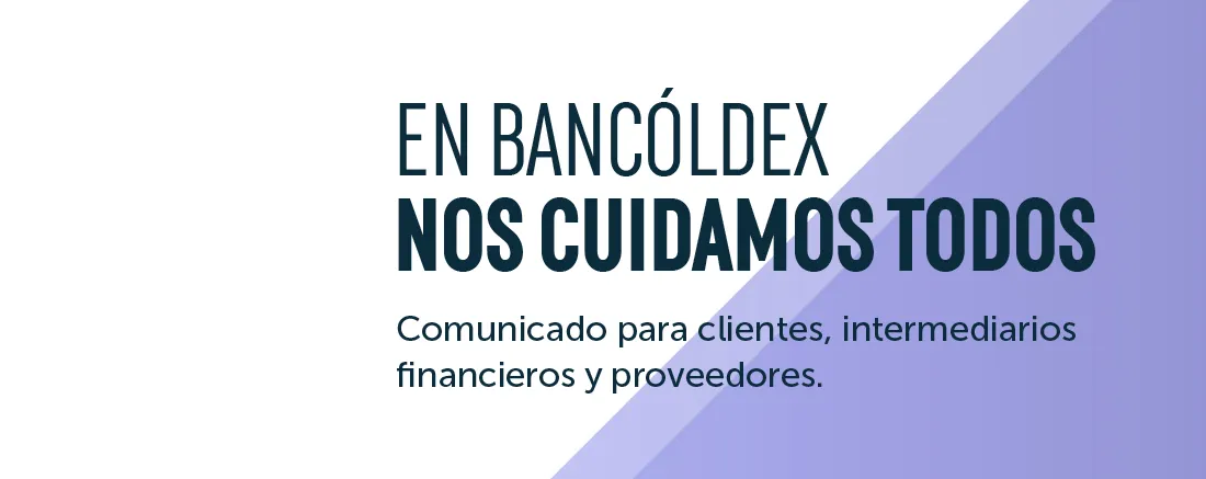 Para Bancóldex, la seguridad y el bienestar de los colombianos son prioridad. Por eso, hemos tomado las siguientes medidas de acuerdo con lo dispuesto por el Gobierno Nacional, para la prevención del contagio por el COVID- 19, a través del Aislamiento Preventivo Obligatorio en todo el territorio colombiano: