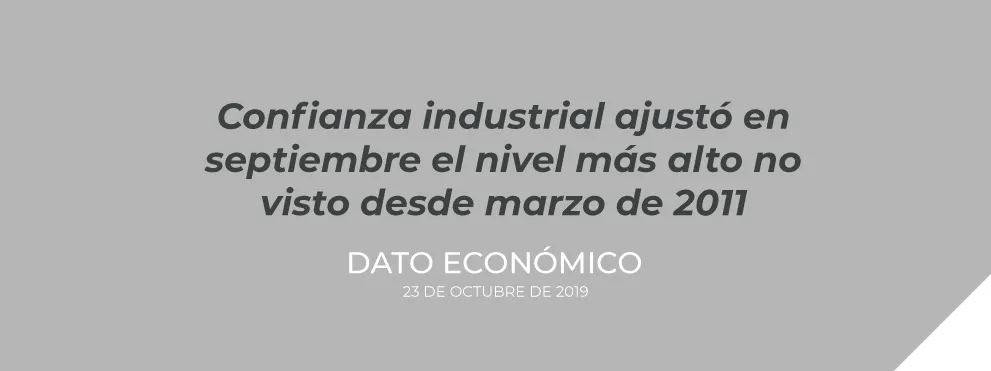 En septiembre el índice de confianza del sector industrial calculado por Fedesarrollo ajustó una variación de 11,5%, subiendo frente al mes de agosto cuando se ubicó en 10,5%, anotando su sexto mes consecutivo de incrementos y el nivel más alto no visto desde marzo de 2011. El aumento en el componente de volumen actual de pedidos jalonó el índice, mientras que el indicador de expectativas de producción se mantuvo sólido.
